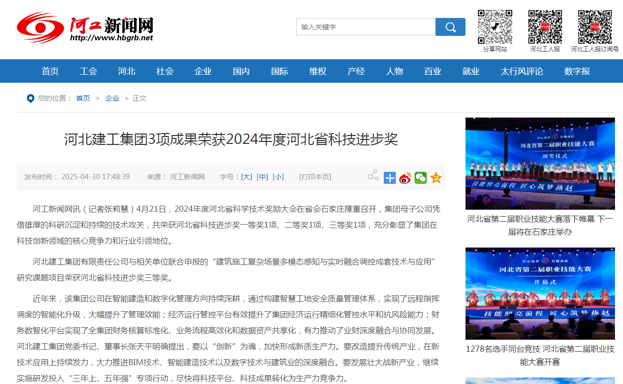 河北建工集團3項成果榮獲2024年度河北省科技進步獎 4月21日,2024年度河北省科學技術(shù)獎勵大會在省會石家莊隆重召開,集團母子公司憑借雄厚的科研沉淀和持續(xù)的技術(shù)攻關(guān),共榮獲河北省科技進步獎一等獎1項、二等獎1項、三等獎1項,充分彰顯了...