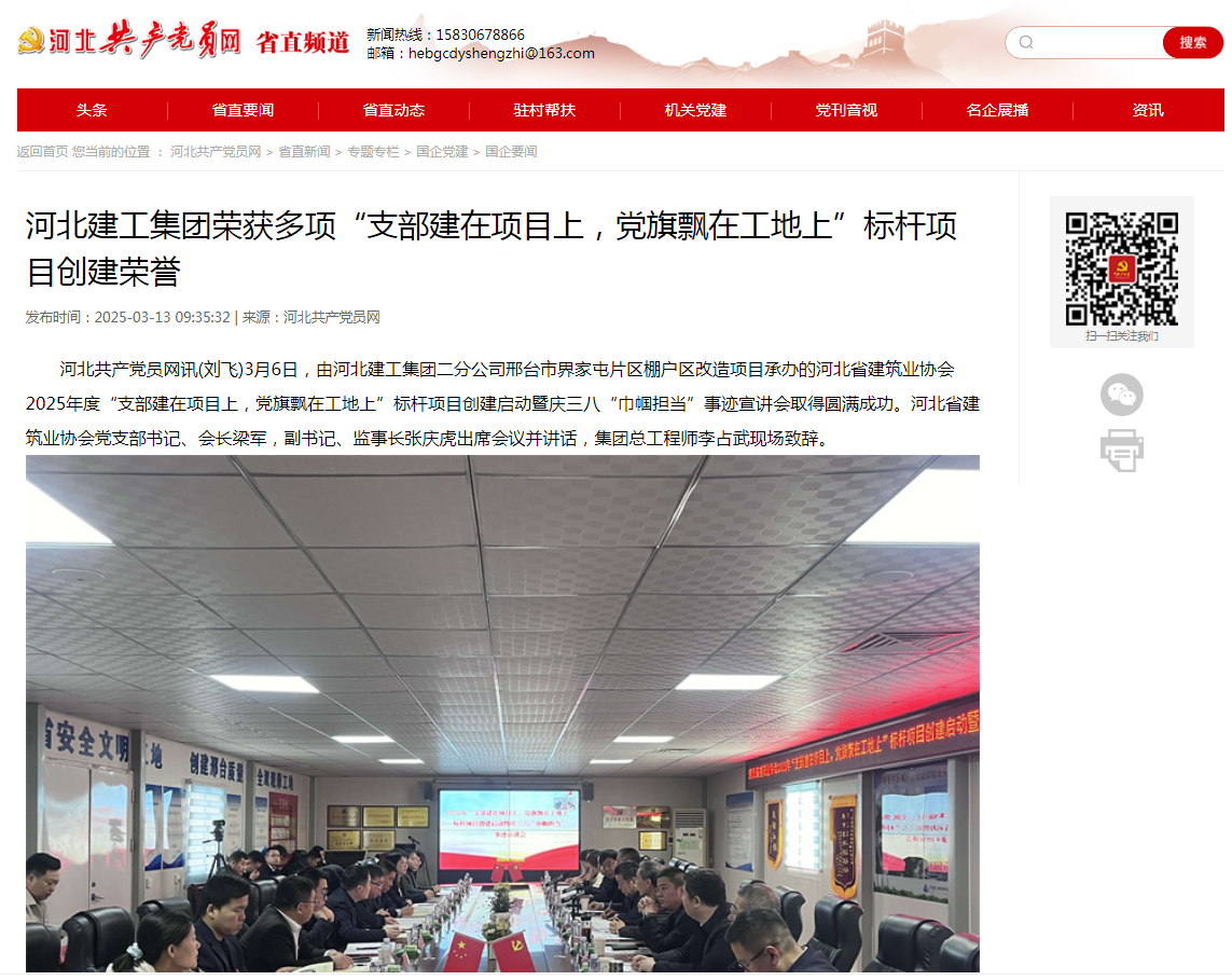 河北建工集團(tuán)榮獲多項“支部建在項目上,黨旗飄在工地上”標(biāo)桿項目創(chuàng)建榮譽(yù) ? ? ? 3月6日,由河北建工集團(tuán)二分公司邢臺市界家屯片區(qū)棚戶區(qū)改造項目承辦的河北省建筑業(yè)協(xié)會2025年度“支部建在項目上,黨旗飄在工地上”標(biāo)桿項目創(chuàng)建啟動暨慶三...